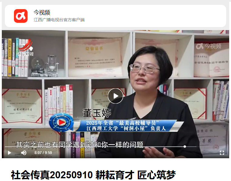 上一条:《江西新闻》:“家文化”暖人心——从家门到校门,抖阴 陪伴护航逐梦路 下一条:《江西教育电视台》:董玉婷:以爱为舟 做学生成长的 “心灵摆渡人” | 最美高校辅导员