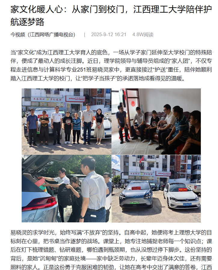 理学院家访小队带着精心准备的“成长礼包”来到易晓灵家中开展了一场暖心的家访:老师们坐在客厅里,和易晓灵及家人拉起家常,了解她的备考经历、对大学生活的担忧,耐心解答专业学习、校园生活等疑问。“到了大学也要保持这份拼劲,遇到困难随时找我们,学校就是你的另一个家。”老师的叮嘱像长辈的牵挂,让易晓灵倍感温暖:“本来还担心一个人去学校会紧张,现在有老师陪着,感觉像家人送我上学一样,特别踏实。”