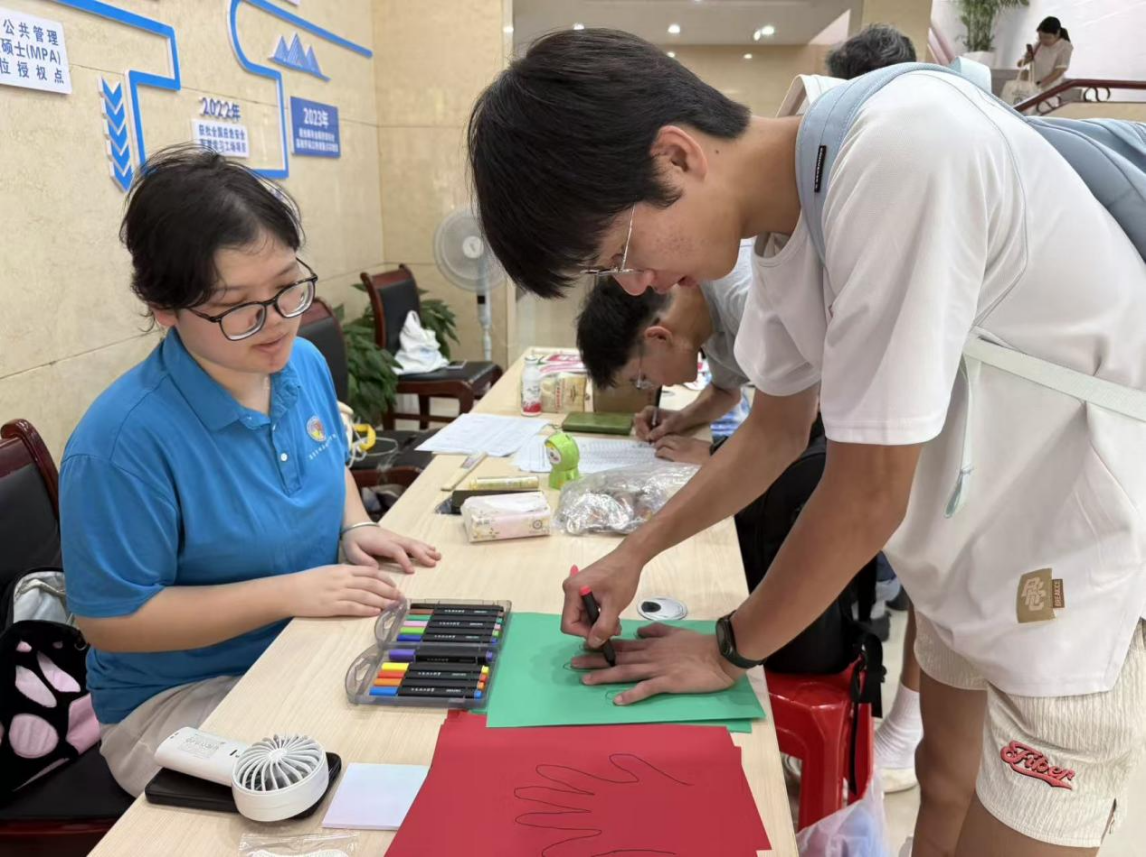 活动以“打卡校园之路,感知应急安全知识,守护身心健康”为主线。在应急管理与安全工程学院楼一楼大厅的“青春之门”,同学们用红、蓝、绿三色水笔创作画下一个个“青春手印”,留下一条条对大学的初印象,共同绘就一幅“新生手印图鉴”。“红色代表忠诚与担当,蓝色代表专业与精益,绿色象征安全与使命,我们希望通过这样的互动设计传递学院“红蓝绿”思政品牌的育人理念,让同学们在活动起点凝聚归属与认同。”应急管理与安全工程学院辅导员易芳如是说道。