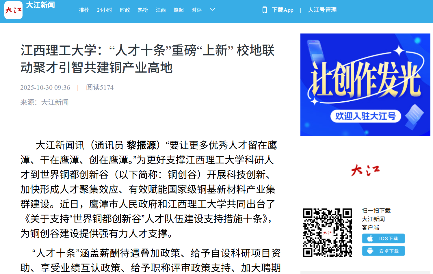 鹰潭市铜产业发展中心领导张爱民表示,“人才十条”推出了岗位晋级、双聘互认、房票补贴等创新举措,解决了人才在跨单位、跨领域发展中的“后顾之忧”,能有效激发人才创新活力。鹰潭将以“人才十条”进一步推动校地人才深度融合,为铜基新材料领域的技术攻关与成果转化按下“加速键”,为国家级铜基新材料集群建设注入“智力内核”,最终实现人才价值与产业发展的同频共振,推动鹰潭从“铜都”向“铜创高地”的跨越升级。