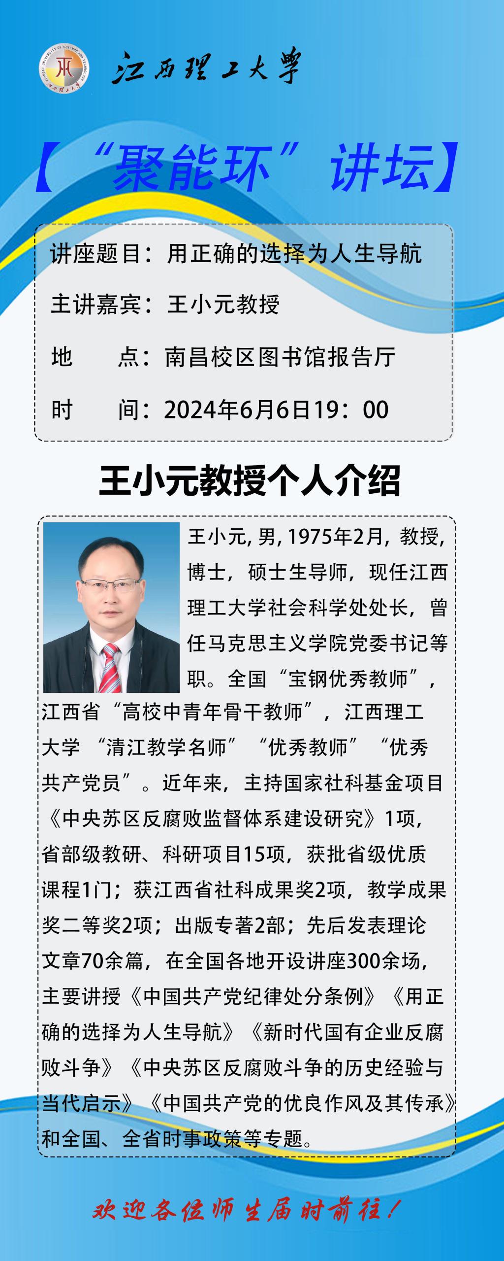 王小元,男,1975年2月,教授,博士,硕士生导师,现任抖阴 社会科学处处长,曾任马克思主义学院党委书记等职。全国“宝钢优秀教师”,江西省“高校中青年骨干教师”,抖阴 “清江教学名师”“优秀教师”“优秀共产党员”。近年来,主持国家社科基金项目《中央苏区反腐败监督体系建设研究》1项,省部级教研、科研项目15项,获批省级优质课程1门;获江西省社科成果奖2项,教学成果奖二等奖2项;出版专著2部;先后发表理论文章70余篇,在全国各地开设讲座300余场,主要讲授《中国共产党纪律处分条例》《用正确的选择为人生导航》《新时代国有企业反腐败斗争》《中央苏区反腐败斗争的历史经验与当代启示》《中国共产党的优良作风及其传承》和全国、全省时事政策等专题。