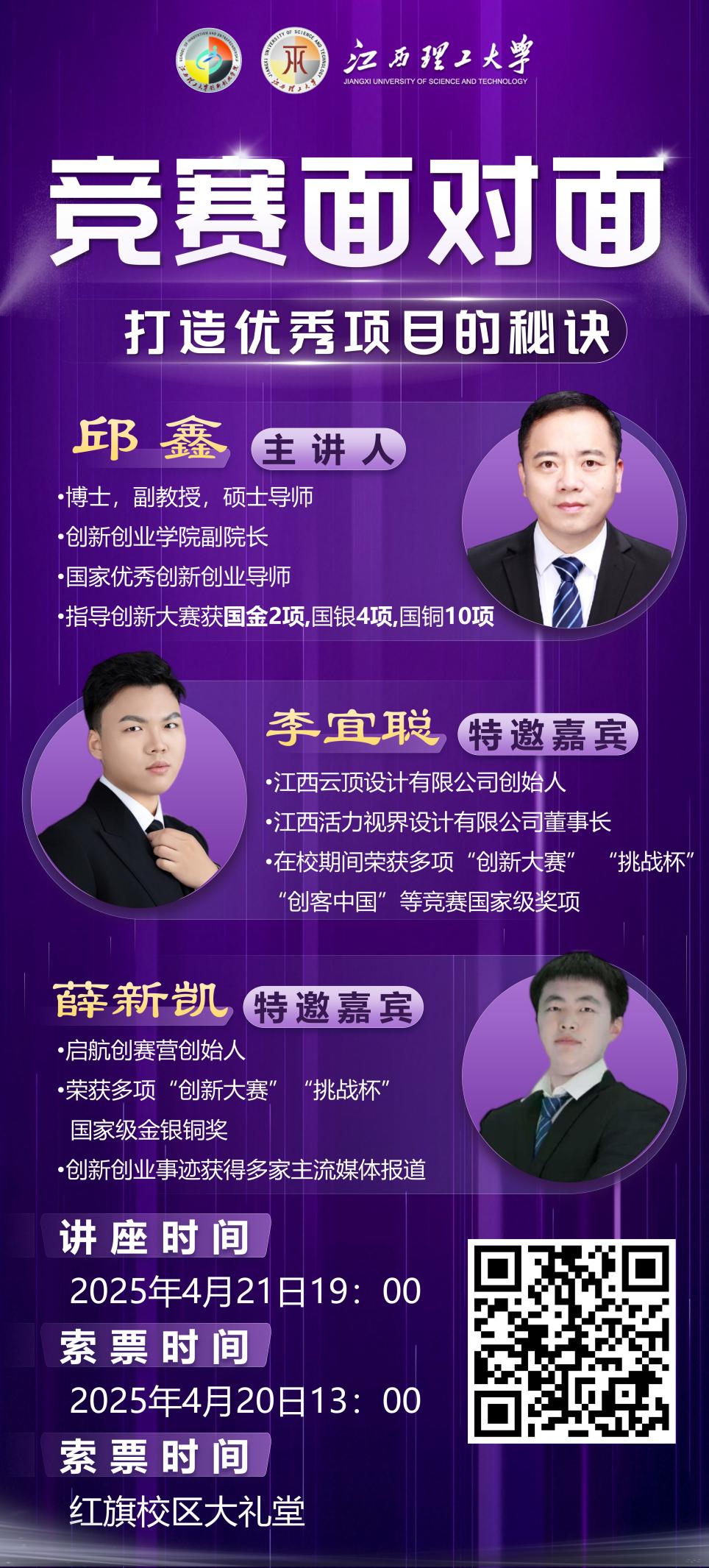 为提高抖阴 学生双创意识和竞赛能力,为创新大赛参赛团队“指点迷津”,创新创业学院将于2025年4月21日19:00在红旗校区大礼堂举办题为《竞赛面对面:打造优秀项目的秘诀》的讲座。
