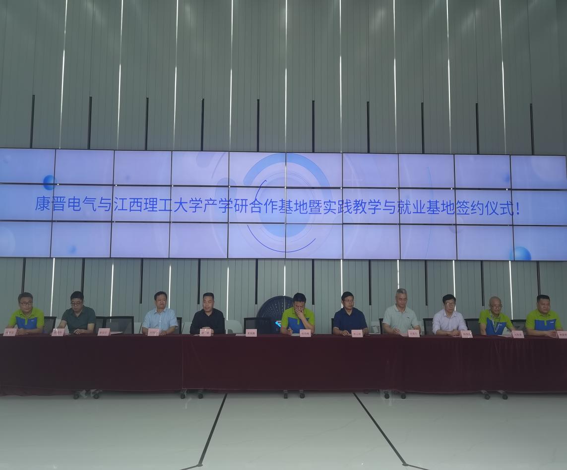 与康晋电气产学研合作基地签约仪式在赣州市康晋电气设备有限公司举行。校党委常委、副校长龚姚腾,赣州高新开发区主任谢博,康晋电气集团副总经理胡伟峰,赣州市康晋电气设备有限公司领导与员工代表,电气工程与自动化学院院长刘细平、副院长林元璋及教师代表参加本次活动。