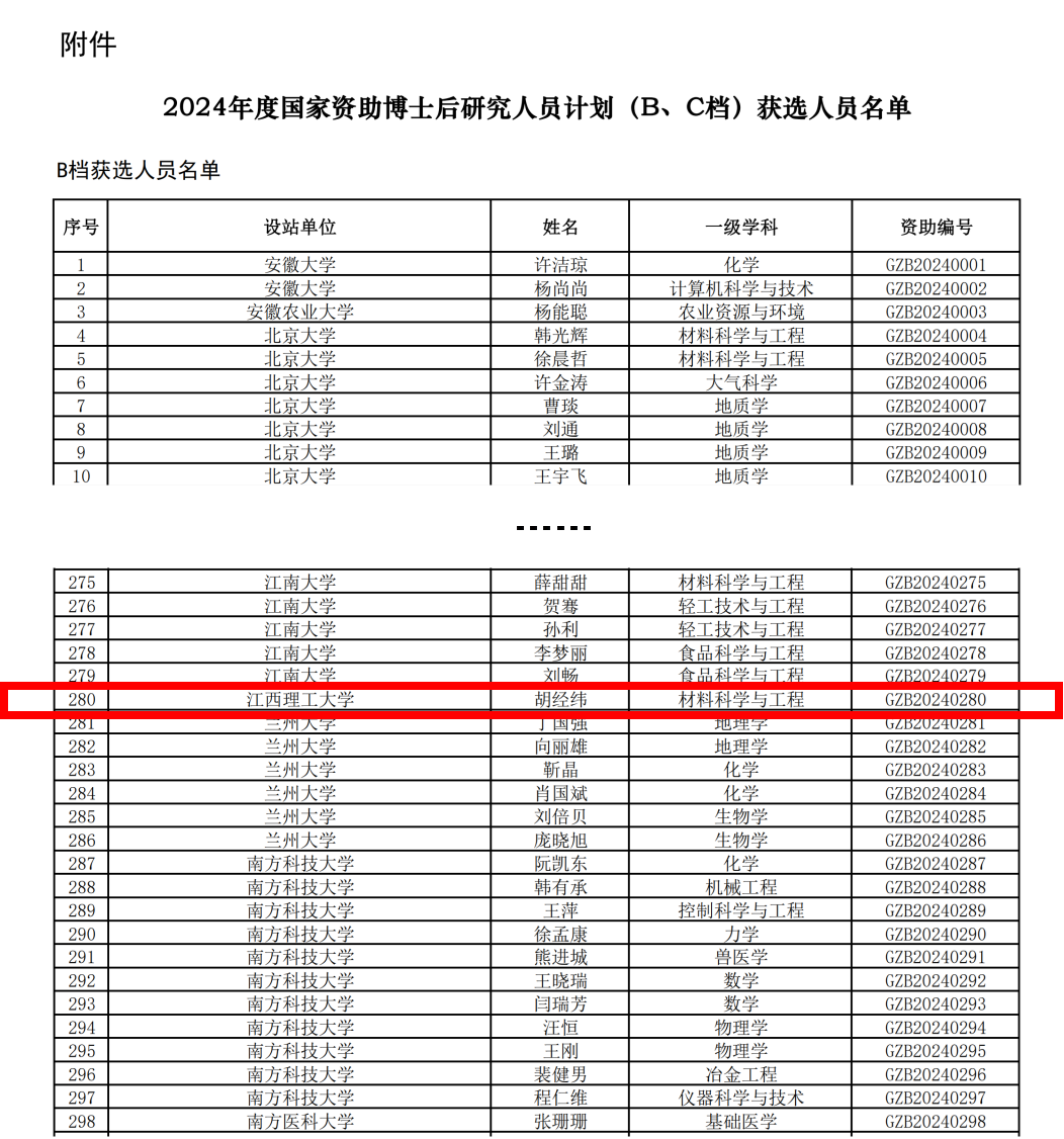材料科学与工程学院新能源汽车动力电池及材料研究所胡经纬博士入选材料科学与工程一级学科B档资助(资助编号:GZB20240280)。