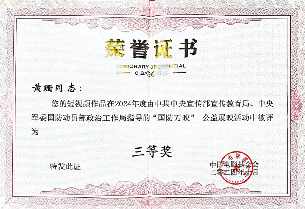 在作品征集环节,全校师生踊跃参与,共收到电影观后感79篇、微视频17部、电影连环画5幅。经严格评审,择优推荐21件作品参加省级评选。其中,黄珊同学的短视频作品以独特的视角和精良的制作脱颖而出,荣获全国三等奖,展现了青年学子对国防事业的关注与思考。