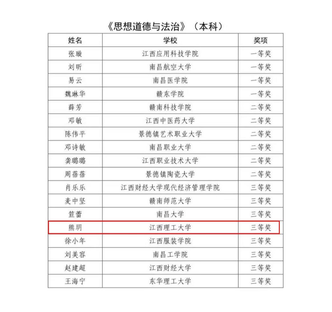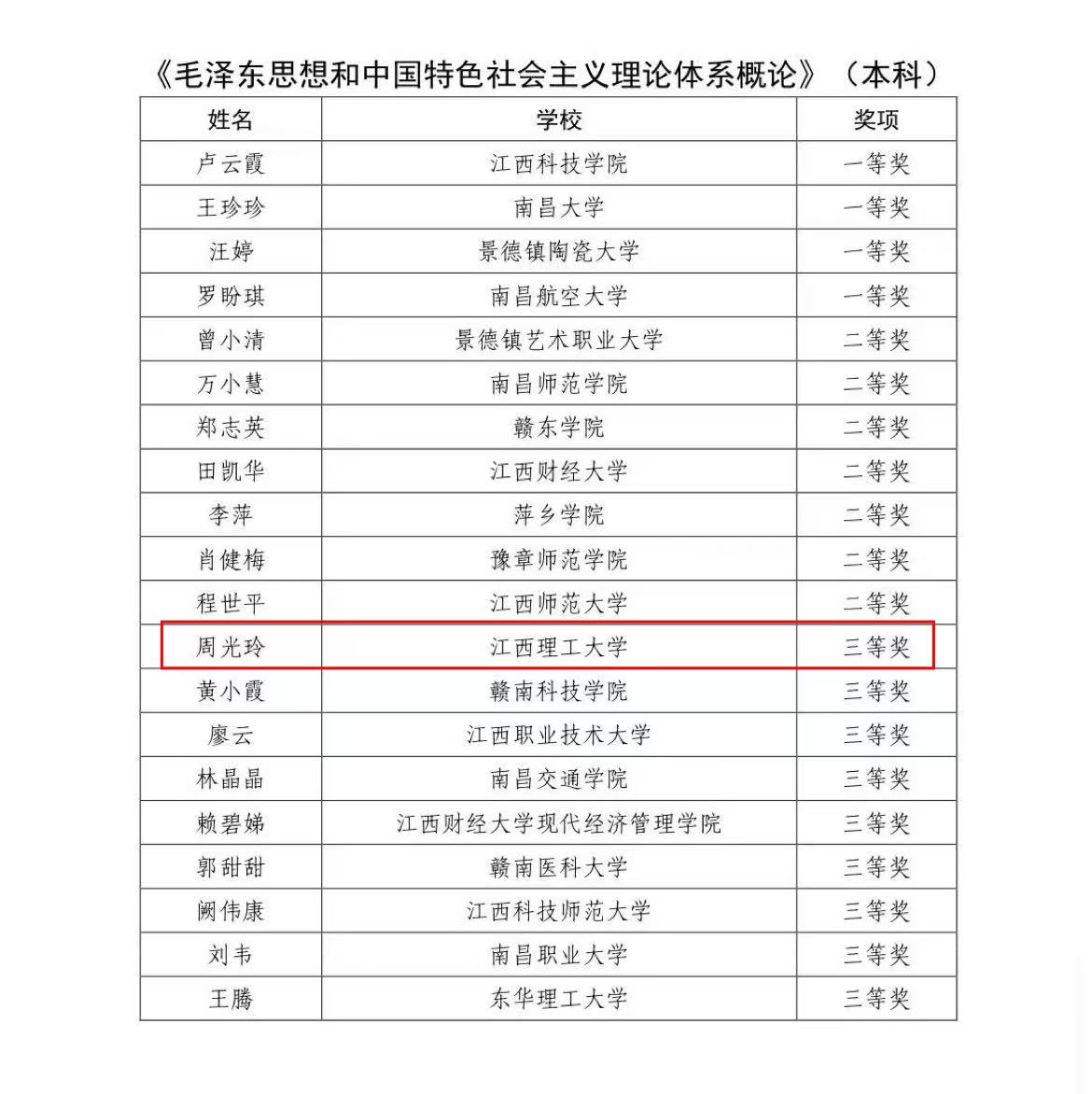 思政课教师李丹荣获《习近平新时代中国特色社会主义思想概论》本科组一等奖、朱贤凌荣获《中国近现代史纲要》本科组二等奖、周光玲荣获《毛泽东思想和中国特色社会主义理论体系概论》本科组三等奖、熊玥荣获《思想道德与法治》本科组三等奖。