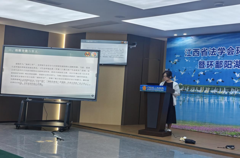 会议共设置两场主题论文交流环节,法学院师生围绕核心议题分享高质量研究成果,充分展现学科实力。在论文交流环节,法学院研究生郭娟、王信凯、曾国强、李小敏等同学分别以《湿地修复的鄱阳湖方案;司法赋能生态修复责任机制的法典化探索》《论流域生态环境案件管辖机制的专门化》《协同治理视域下鄱阳湖生态修复责任制度的规范重构》《生态修复的本质检视与路径优化》为题作汇报。孟春阳作为交流环节与谈人,对发言人的研究成果逐一点评,其点评兼具专业性与针对性,获得与会专家学者的高度认可。