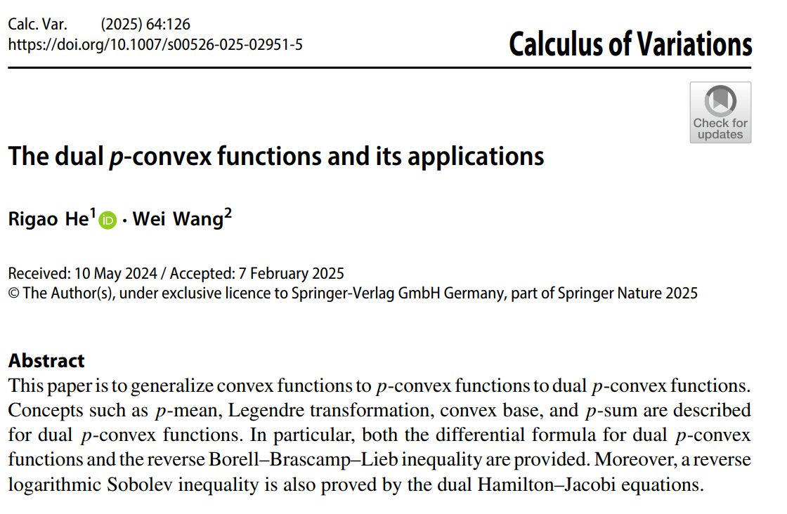 理学院何日高副教授与湖南科技大学数学与计算科学学院汪卫教授合作的高水平论文《The dual p-convex functions and its applications》(对偶p-凸函数及其应用)在数学著名期刊《Calculus of Variations and Partial Differential Equations》(简称“CVPDE”,中科院一区top,影响因子2.4)上发表。何日高为论文第一作者和通讯作者,湖南科技大学汪卫教授深度参与该研究。这也是抖阴