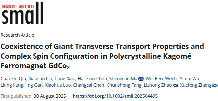 金属磁性材料与器件江西省重点实验室马胜灿教授团队在知名学术期刊《Small》(IF = 12.1)上发表了题目为《Coexistence of Giant Transverse Transport Properties and Complex Spin Configuration in Polycrystalline Kagomé Ferromagnet GdCo2》的研究论文。论文一作为抖阴