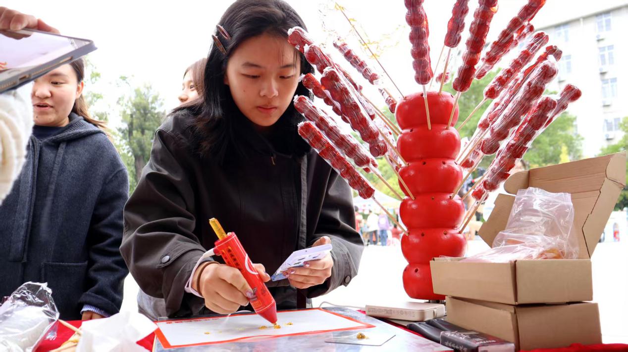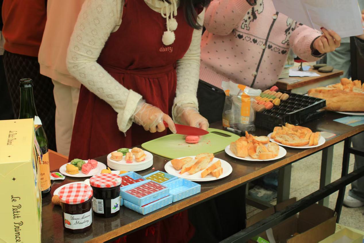 异国风味同样令人流连:德国香肠咸香多汁、俄罗斯糖果醇厚绵密、法式马卡龙缤纷甜润、西班牙塔帕斯鲜香开胃……每一种味道都带着独特的地域印记,带来跨越国界的味觉冲击。师生们穿梭在香气里,手中刚攥着糖葫芦,又接过马卡龙,酸甜还没落味,咸香已缠上舌尖。不同风味在唇齿间叠着暖意,把文化的烟火揉进了滋味里。王思怡同学感慨:“在美食区才逛了一会儿,清茶的余韵还未散尽,眼睛就盯上了隔壁的马卡龙,没走几步就可以尝遍不同国家的美食,这也太得劲了!”