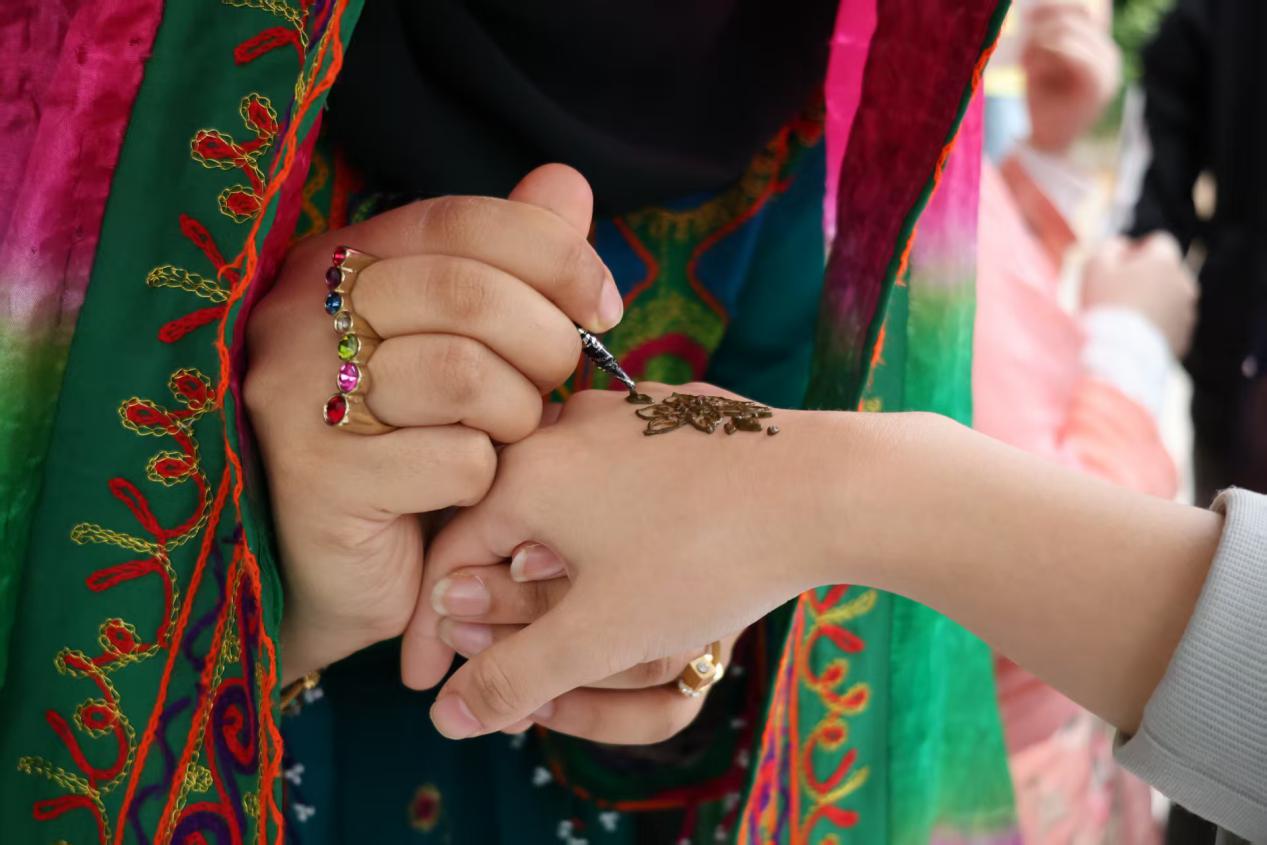 (图为巴基斯坦志愿者为学生手绘海娜)